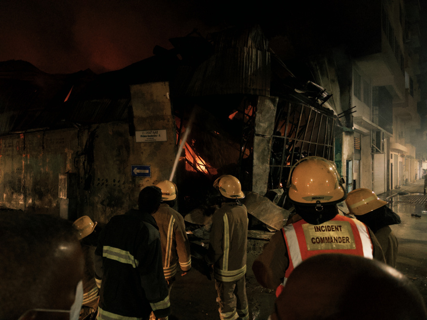 Firefighters continue working to put out the fire that started at Prime Godown on Izzuddin Magu, Male' city on March 18, 2026. (Sun Photo/Aaish Ashraf)