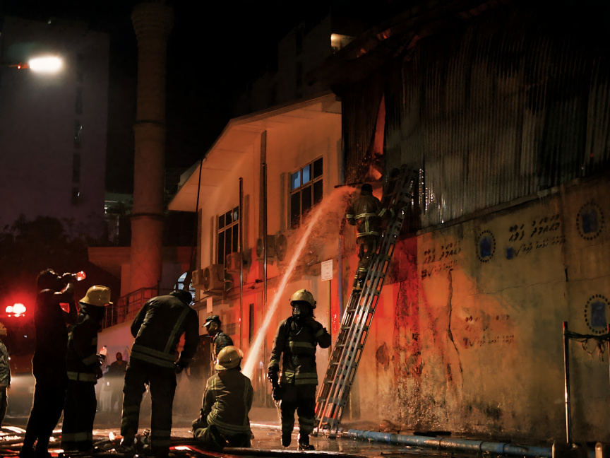 Firefighters continue working to put out the fire that started at Prime Godown on Izzuddin Magu, Male' city on March 18, 2026. (Sun Photo/Aaish Ashraf)